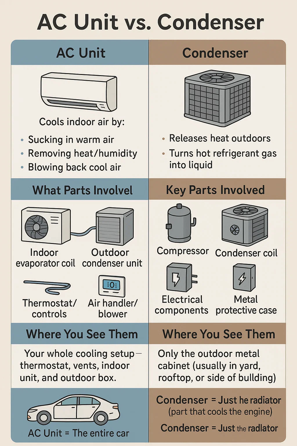 Voici la nette différence entre un climatiseur (unité AC) et un condenseur :